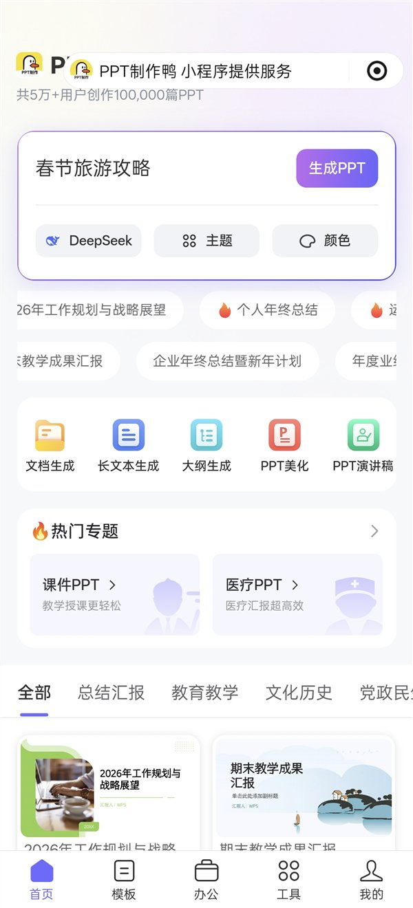 聊天框中輸入并發(fā)送“#PPT制作鴨”,再點(diǎn)擊就能看到PPT制作鴨小程序,打開(kāi)輸入主題就能快速生成PPT,方便至極。