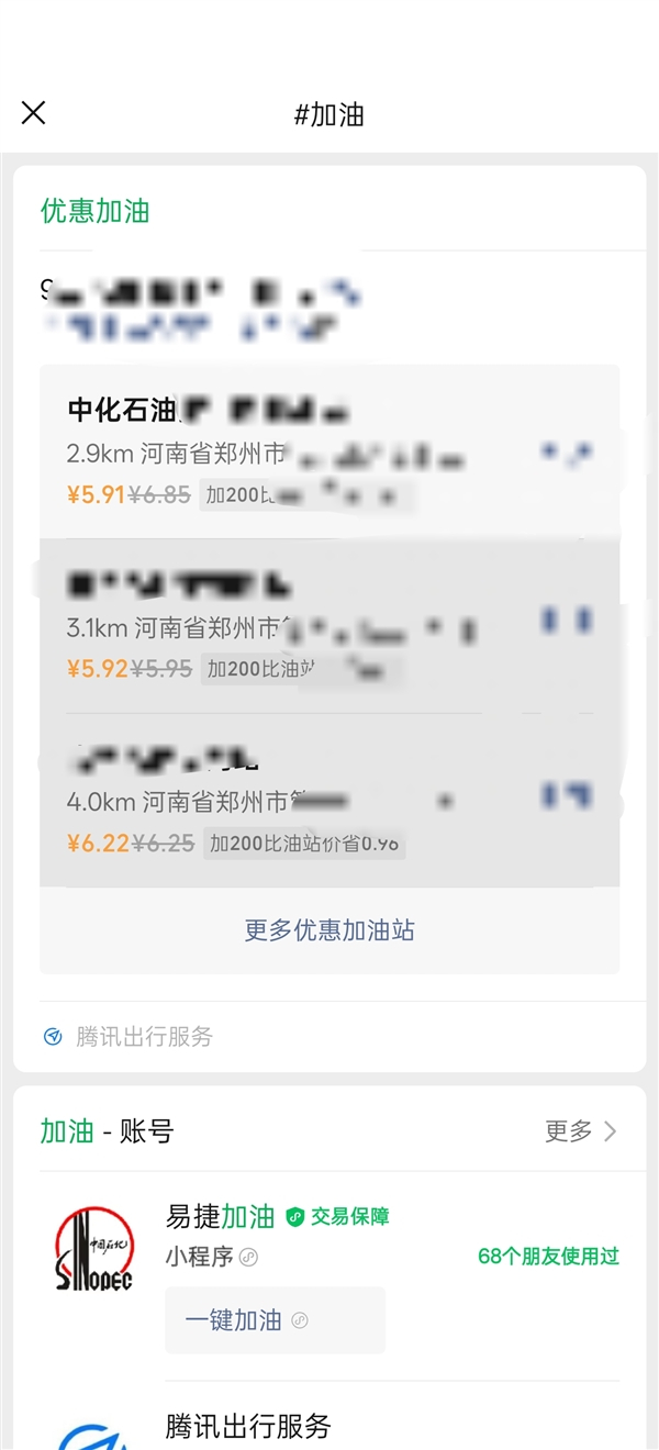 和查詢火車票的操作類似,微信上輸入并發(fā)送“#加油”,再點(diǎn)擊就能查看附近的加油站以及油價(jià)。