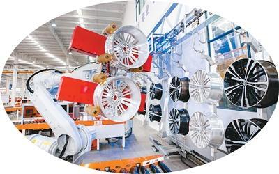 安徽今飛輪轂有限公司的智能化車間內(nèi),六條全自動化產(chǎn)線高效運(yùn)轉(zhuǎn),工人有序協(xié)作,一批批新能源汽車輪轂順利下線。張軍攝(人民視覺)