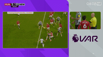第63分鐘,紐卡角球機會,禁區(qū)內(nèi)爭搶時利桑德羅有手球,VAR介入主裁聽完耳機示意沒有點球↓