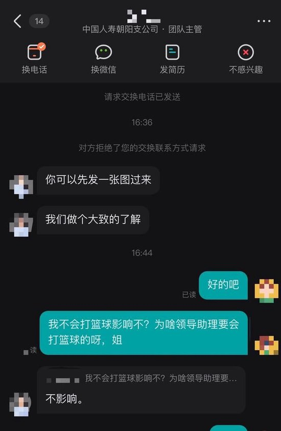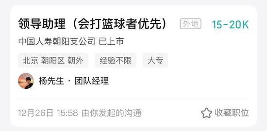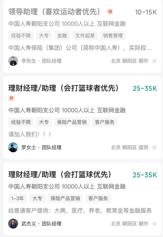 有網(wǎng)友注意到,在BOSS直聘平臺(tái)上,辦公地點(diǎn)位于北京朝陽(yáng)區(qū)世紀(jì)財(cái)富中心西塔6層的中國(guó)人壽朝陽(yáng)支公司發(fā)布了多條招聘信息。其中,招聘領(lǐng)導(dǎo)助理、理財(cái)經(jīng)理/助理的崗位,在后方用括號(hào)備注了“會(huì)打籃球者優(yōu)先”“喜歡音樂者優(yōu)先”“運(yùn)動(dòng)文藝愛好者優(yōu)先”,發(fā)布者有的顯示為中國(guó)人壽朝陽(yáng)支公司的業(yè)務(wù)主任,有的顯示為團(tuán)隊(duì)主管。