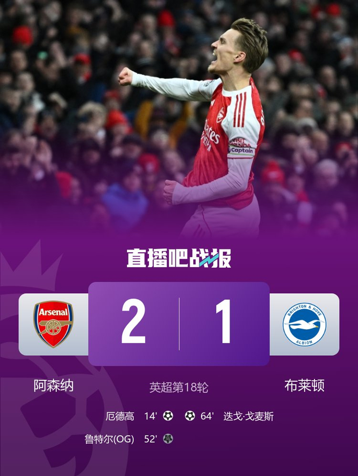 直播吧12月28日訊 北京時(shí)間12月27日23:00,2025-26賽季英超聯(lián)賽第18輪,阿森納坐鎮(zhèn)酋長(zhǎng)球場(chǎng)迎戰(zhàn)布萊頓。上半場(chǎng)厄德高接薩卡助攻,打進(jìn)自己本賽季首球,阿森納暫1-0布萊頓;下半場(chǎng)賴斯角球造成魯特爾烏龍,迭戈·戈麥斯補(bǔ)射扳回一球,加布里埃爾復(fù)出,最終阿森納主場(chǎng)2-1布萊頓,收獲聯(lián)賽3連勝,2分優(yōu)勢(shì)領(lǐng)跑積分榜。