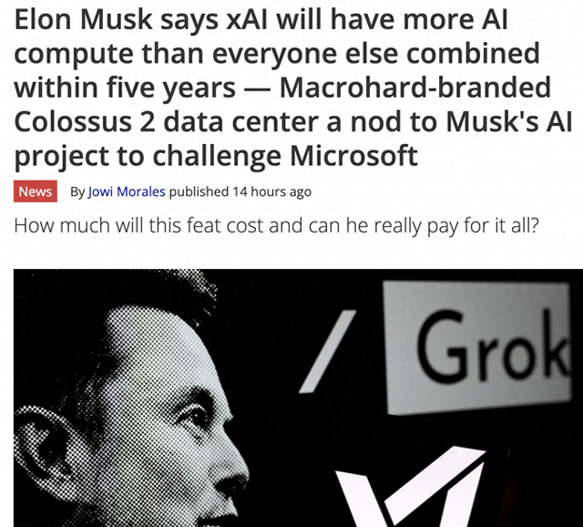 近日,在社交平臺上,馬斯克回應一則關于“xAI是創(chuàng)新者首選團隊”的帖子時明確表示:“五年內,xAI的AI計算能力將超過其他所有公司加起來的總和。”