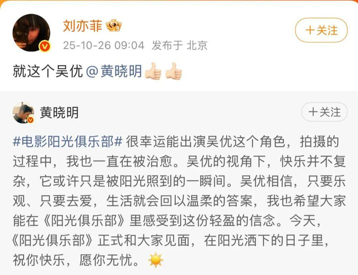 兩人因此結(jié)下一段友誼。今年10月,黃曉明的電影新作《陽光俱樂部》全國公映時,劉亦菲還在社交賬號發(fā)了兩個“大拇指”,支持黃曉明新片:“就這個吳優(yōu)@黃曉明。”